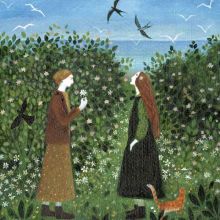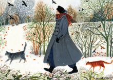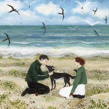 Dee Nickerson's insightful images of friendship and life in rural East Anglia come together to produce a delightful greeting cards range. Artist's statement It is usually late morning when I start to paint, working late into the night, stopping for supper and, while it's daylight, to gaze out of the window. During winter, I settle by the fire and wireless in the caravan I share with a partner and three feline muses. In summer, I move outside, under the lean-to. Combining memory, imagination and observations of the changing seasons, weather, people, cats, dogs and birds, I elaborate on little moments of ordinary life seen at home, from my bicycle, in the local towns and villages, or on trips about East Anglia.