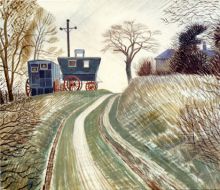 Ravilious is particularly known for his watercolours of the South Downs, Castle Hedingham, and other English landscapes, which examine English landscape and vernacular art with an off-kilter, modernist sensibility and clarity. He served as a war artist and was the first British war artist to die on active service in World War II when the aircraft he was in was lost off Iceland.