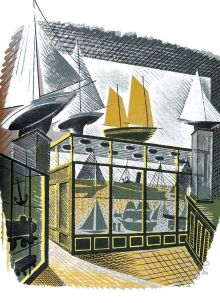 Ravilious is particularly known for his watercolours of the South Downs, Castle Hedingham, and other English landscapes, which examine English landscape and vernacular art with an off-kilter, modernist sensibility and clarity. He served as a war artist and was the first British war artist to die on active service in World War II when the aircraft he was in was lost off Iceland.