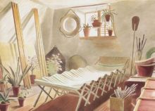 Ravilious is particularly known for his watercolours of the South Downs, Castle Hedingham, and other English landscapes, which examine English landscape and vernacular art with an off-kilter, modernist sensibility and clarity. He served as a war artist and was the first British war artist to die on active service in World War II when the aircraft he was in was lost off Iceland.
