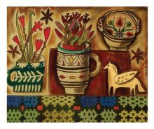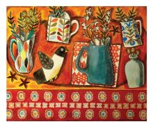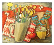Her work describes small domestic objects, jugs, plates and mugs, seen from an intuitive, sometimes dream-like perspective. Speaking about her work, “The simple, quiet act of placing a glass of wild flowers against a coloured piece of fabric is the kind of thing that interests me”.