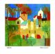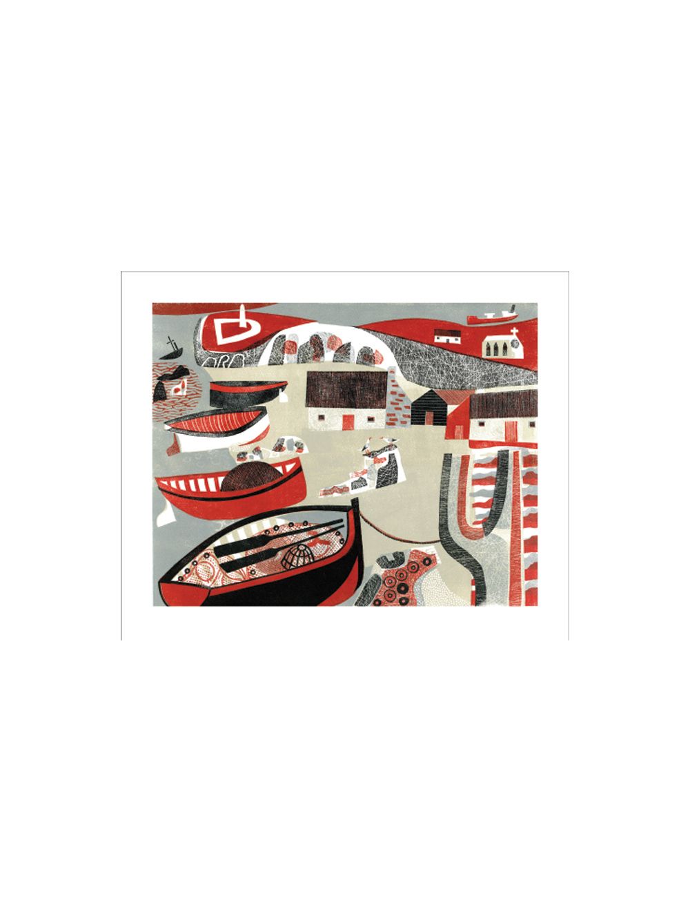 Boats, Lighthouse and Church Linocut by Melvyn Evans