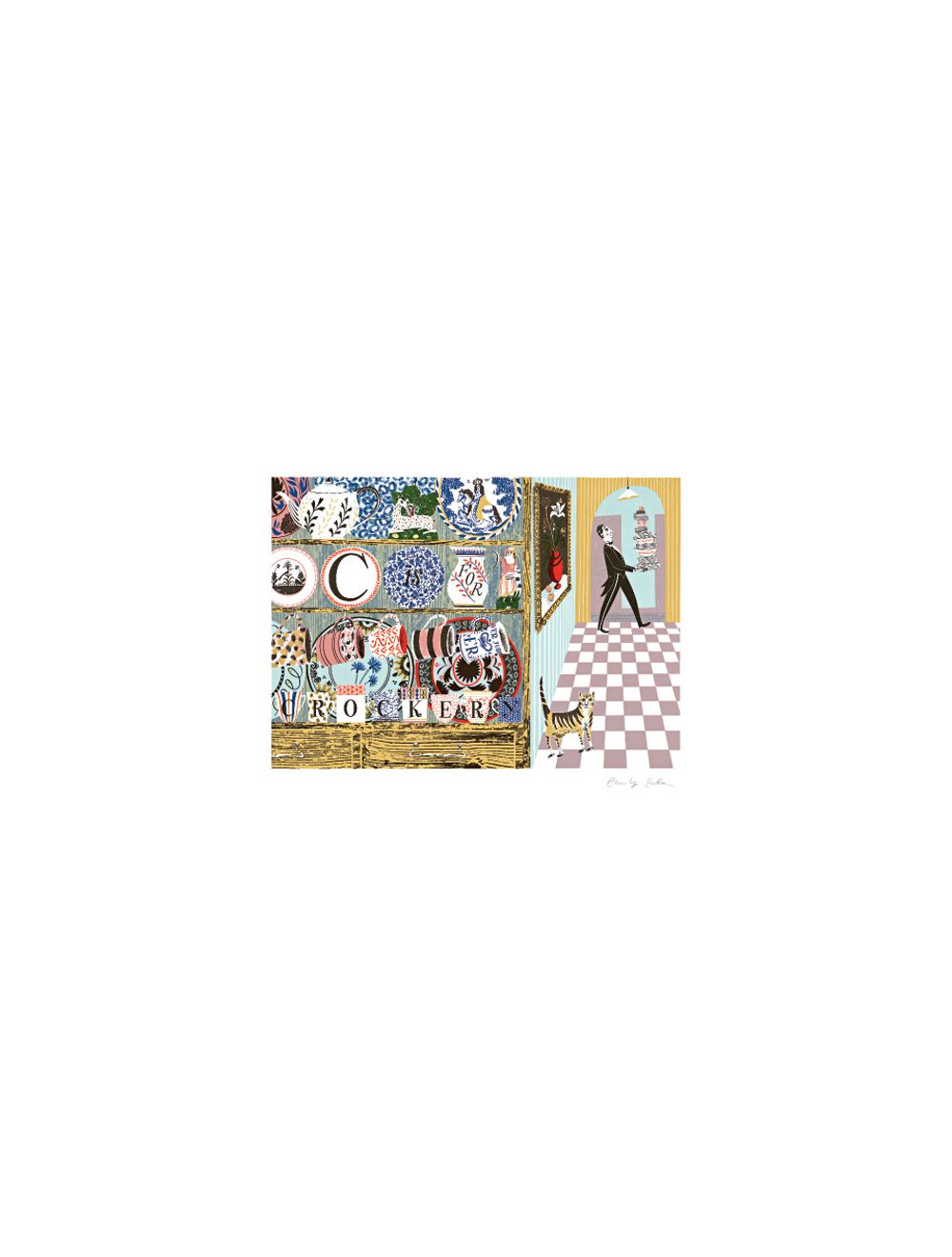 'C' for Crockery screenprint - Emily Sutton Art Greeting Card. This card is from the Alphabet series of cards designed by Emily Sutton based on the alphabet. The card portrays Emily’s collection of ceramics.