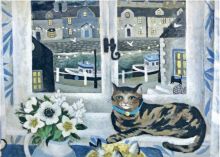 Each of Vanessa’s still lifes observes the simple beauty of everyday objects – a moment captured in time. A vase of garden flowers, a bowl of lemons (their acid yellow placed against the deep magenta plum), a striped shell – each is placed deliberately within the framework of the painting combining muted subtle colour with jewel-like accents.
