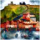 From an original painting: Inks, gouache, acrylics, gold leaf and gold thread.