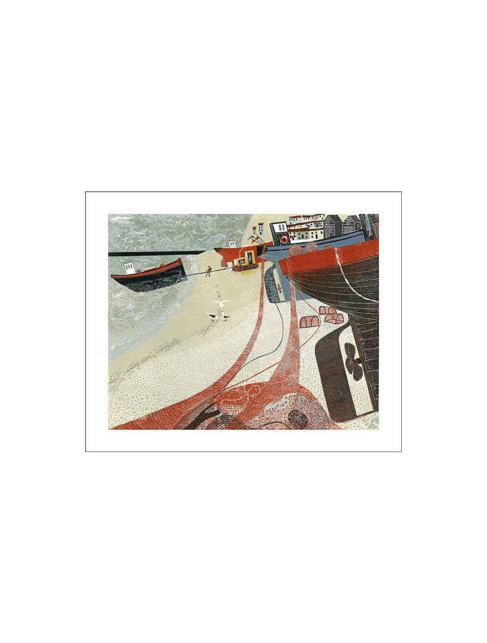 Fishing Boats on Hastings Beach Linocut by Melvyn Evans