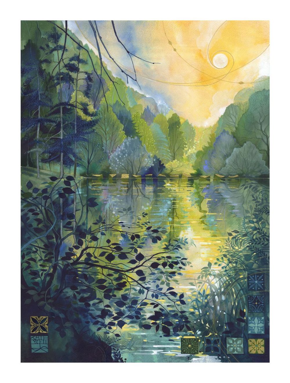 From an original Gouache, inks, acrylics, pigment sticks, pencils, gold leaf and gold thread.