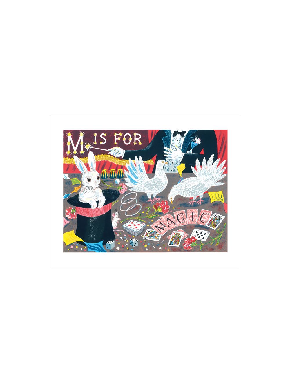 M is for Magic screenprint - Emily Sutton Art Greeting Card. This card is from the Alphabet series of cards designed by Emily Sutton based on the alphabet. The card portrays a mysterious conjurer and the tools of his trade and takes its inspiration from Victorian posters.