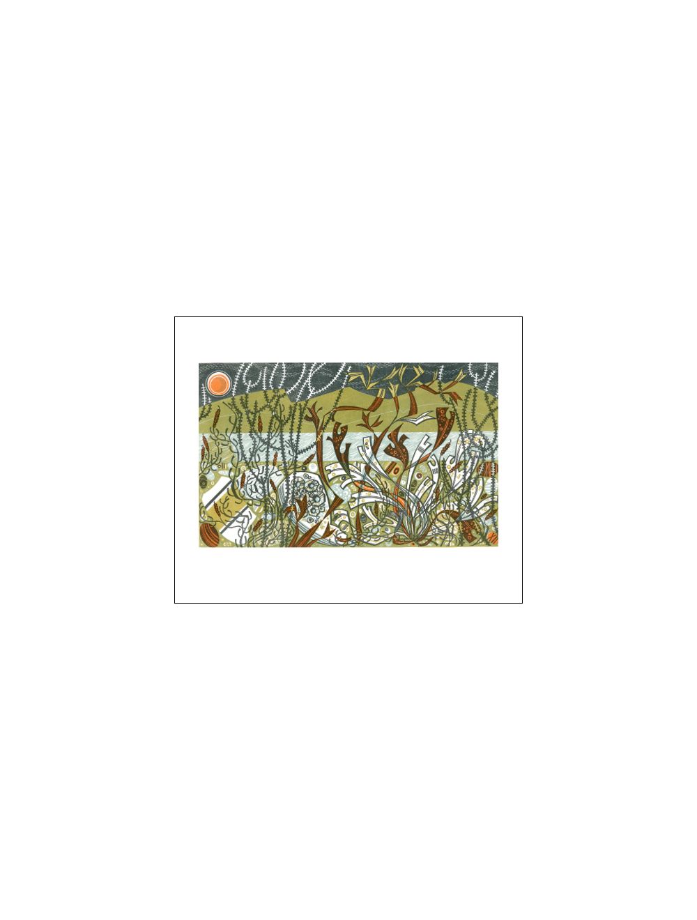 Angie Lewin creates limited edition linocut, wood engraving, lithograph and screen prints – often inspired by skeletal plant forms seen against the sea and sky of North Norfolk and the Scottish Highlands. She is a member of the Royal Society of Painter-Printmakers and of The Society of Wood Engravers.