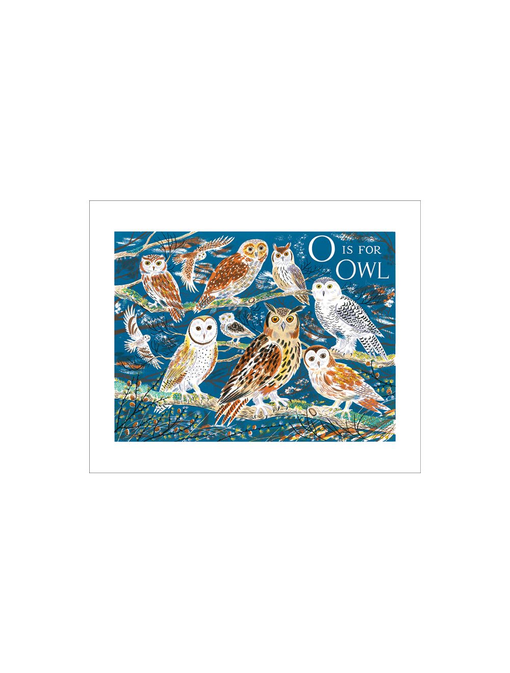 O is for Owl by Emily Sutton Art Greeting Card. This card is from the Alphabet series of cards designed by Emily Sutton based on the alphabet and takes its inspiration from old German educational charts as well as the display of a large variety of owl species in an exhibition at Scarborough Museum.