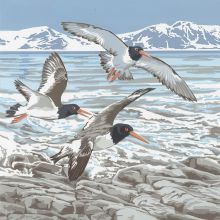 She works in two media disciplines – watercolour painting and printmaking – and her products arise out of one or the other. The common theme throughout is wildlife, sourced from numerous field trips to safari parks and bird reserves, and she has built up an impressive folio of her own photography from which to select any number of shots to create the right composition and develop further into designs.