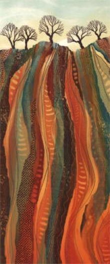 In Rebecca’s hands, the landscape undergoes a stylisation process that clarifies the pattern of fields and hedgerows into an almost abstract pattern of intersecting shapes. Add in strong colours and a variety of interesting textures and you have her distinctive landscape style.