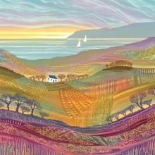 In Rebecca’s hands, the landscape undergoes a stylisation process that clarifies the pattern of fields and hedgerows into an almost abstract pattern of intersecting shapes. Add in strong colours and a variety of interesting textures and you have her distinctive landscape style.