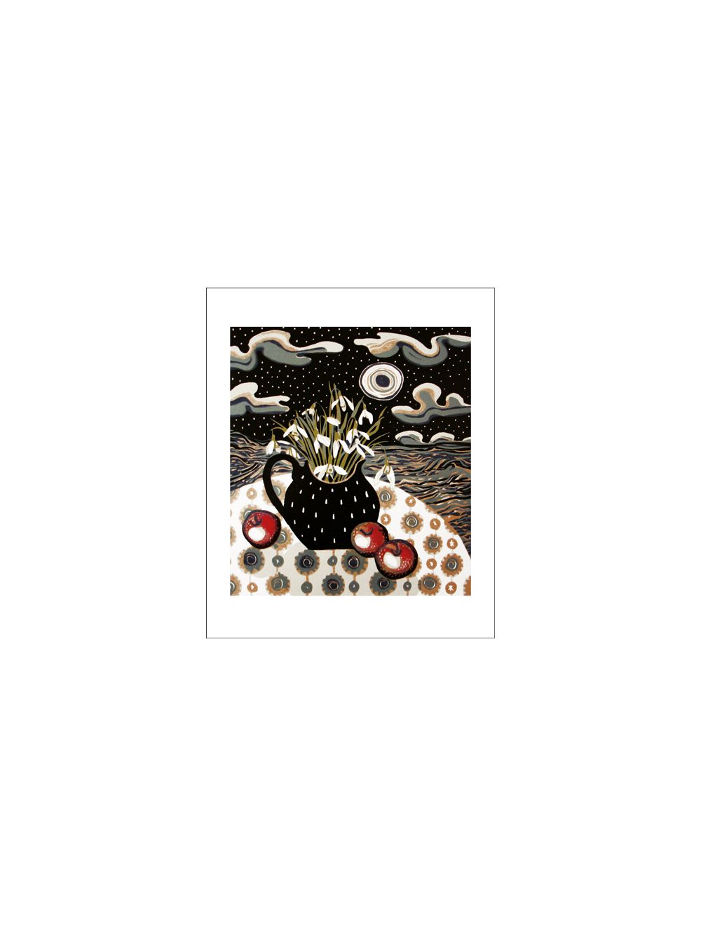 Her prints reveal a fascination with still life and the richness of her palette and her strong graphic sensibility reflect her love of 20th century artists and craftsmen, 50s textile design and Scandinavian ceramics.