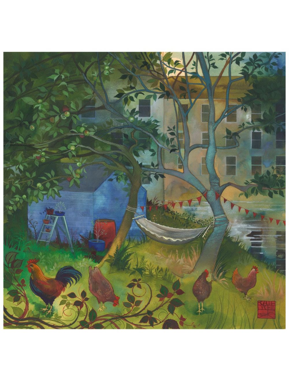From an original painting: Inks, gouache, acrylics, gold leaf and gold thread